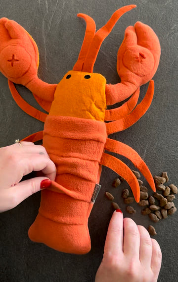 Vores hummer er en af vores helt store favoritter i kategorien aktivitetsbamser, og er samtidig også en best-seller! Du kan gemme godbidder eller din hunds yndlingsfoder i stort set alt vores aktivitetslegetøj, i hummeren her kan du gemme det i "folderne" i dens skjold og kløerne.